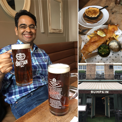 コッツウォルズでは「洗練されたモダンな英国料理」を堪能したが、ここに来て、フィッシュ&チップスやブリティッシュ・パイ(ビーフをアイリッシュビールなどで煮た料理)を注文。それぞれ前菜とメインを一皿ずつ頼んだら、たいへんなヴォリュームに!! 英国料理の本領発揮というところか。さすがに食べ尽くせず。