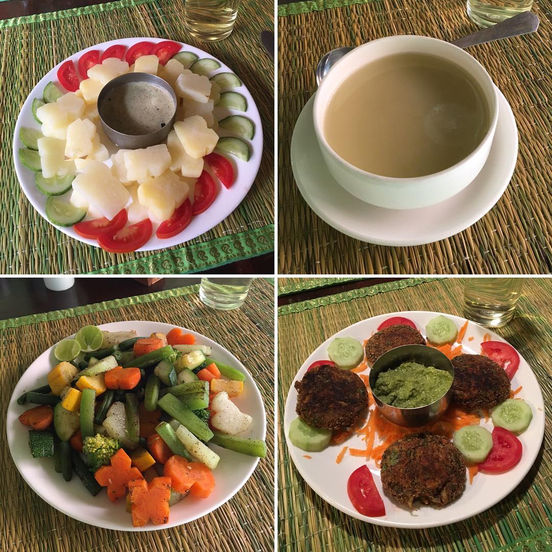 初日は昼夜、フルーツのみ。2日目の昨日は、朝昼晩と野菜料理。朝はジャガイモ、昼はスープに野菜のグリル。夜は豆と野菜のカツレツ風グリル。