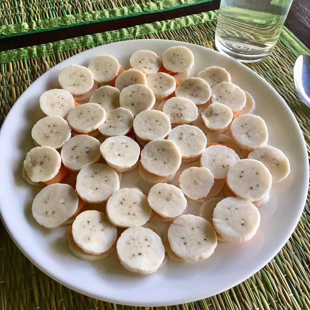 そして本日の朝ごはん。皿の上にきちんと並んだ3本の小さなバナナに、目が釘付け。