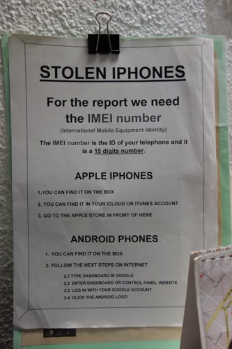 というわけで、画面がスペイン語だし、どうしようもできないしで、一旦、引き上げることにする。ポリスはシリアルナンバーとIMEIナンバーがなくても、盗難された証明書は発行できると言っていたが、追跡調査をするにはそれが必要らしい。稀に戻ってくることがあるという。