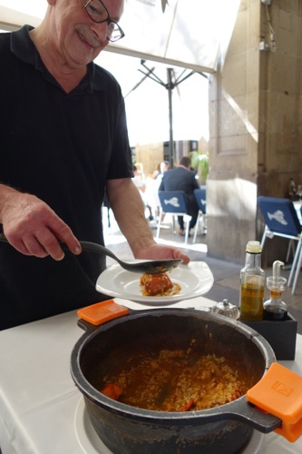 パエーリャ発祥の地、バレンシアのパエリヤに比べて、茶色っぽくて汁気が多く、塩分もかなり強い印象のカタルーニャ風パエーリャだが、こんな状態で出されるのは、初めてだ。