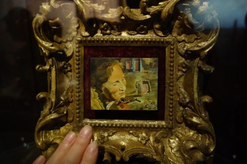 ◎肩にラムチョップを載せて微笑むガラ。ラムチョップ、だ。精緻に描き込まれているだけに、そこそこ大きめの作品だろうと思っていたのだが。ガラス越しに小さなフレームに入れられたそれは……