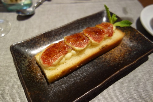 ◎デザートも2種類注文。リキュールがしみ込んだしっとりスポンジケーキの上に、カスタードクリーム(クレマ・カタラーニャ)が載っており、その上にイチジクのスライス、カラメルが焼き付けられている。