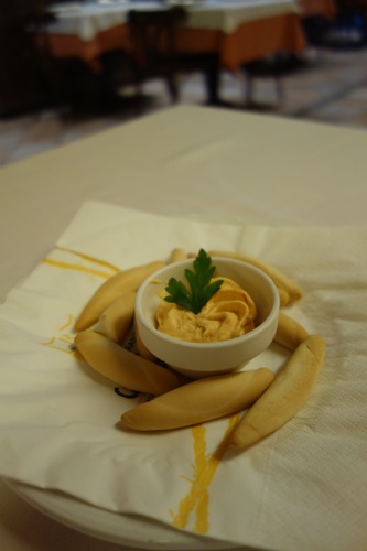◎パンの代わりに出て来たのは、クラッカー。クリーミーなトッピング付き。