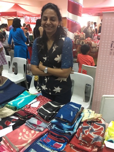 バンガロール在住の彼女が手がけたオリジナルの「しぼり」スカーフ。ここでは1枚、お買い物。