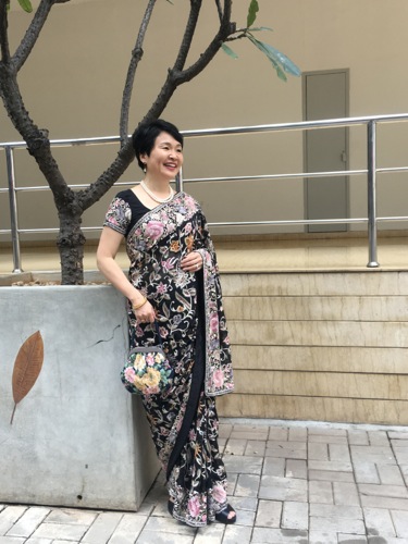 わたしは久しぶりにパルシー刺繍のサリーを着用。7年前のムンバイ在住時に購入したもの。お気に入り。バッグは以前、母からもらっていた着物用。ビーズが施されたもので、このサリーとよく似合う。