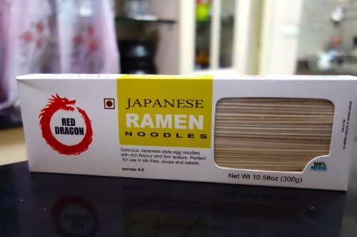 そんな最中、1MGモールの中にあるFOODHALLで見つけた、インド産の麺。そば、全粒粉のラーメン、そしてこの普通のラーメンと、数種類の麺がある。4〜5食分で125ルピー。