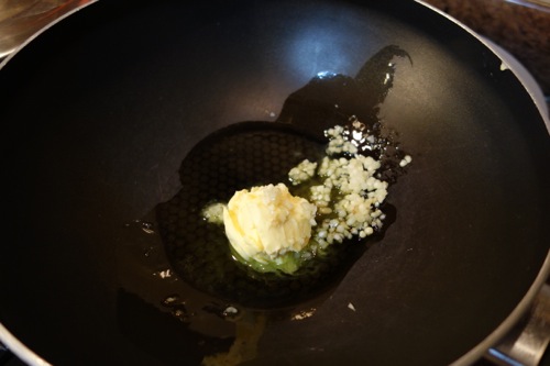 フライパンにオーガニックのバターを入れ、クラッシュしたニンニクを入れる。
