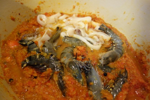 エビとイカをどさっといれ、煮込んだあと、最後にヨーグルト、そして牛乳を入れて出来上がり。