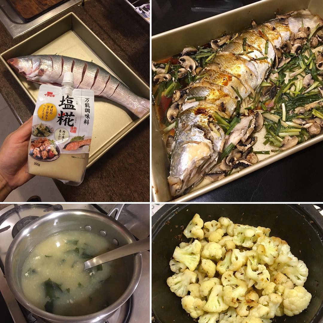 🐟昨夜のメインは毎度おなじみのインディアンサーモン。友人からいただいた「塩麹」をぬりぬりして冷蔵庫にいれておく。下準備さえしておけば、オーヴンに入れて焼くだけの便利さ。生姜の千切り、ネギとマッシュルームなどを適当にちりばめ、焼き上がりにつーっと醤油を垂らすだけの簡単さ。