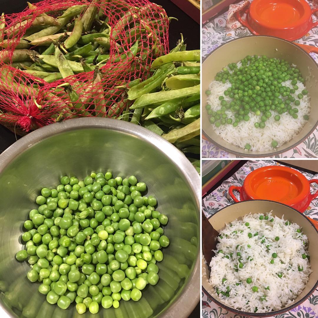 🌱ご飯は香り豊かな高級インド米(といっても廉価)、バスマティライスを炊く。豆ご飯を炊くつもりが、ビッグバスケットの宅配サーヴィスが間に合わず、ご飯だけ炊き始めていた。そこにグリーンピーが届いたので、急いで皮をむき、豆だけ別に茹でて、最後にご飯と混ぜ合わせた。このやり方、悪くない。むしろ豆だけに塩味が染みる上、豆が崩れないからいいかもしれない。
