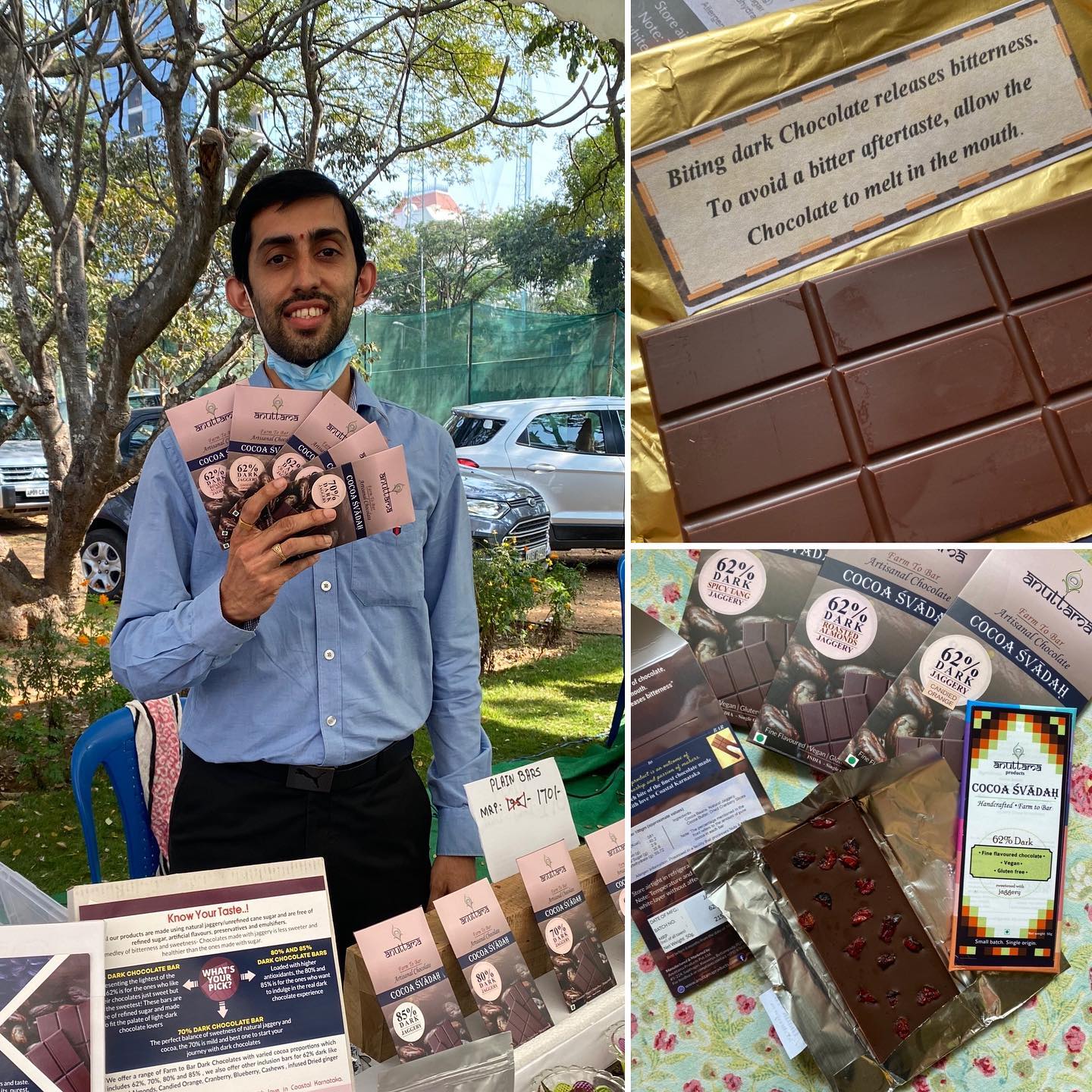 ナガランド州出身の若者らは、伝統的な牛肉や豚肉のピクルス、発酵大豆や筍の漬物を売る。マンガロールにカカオの農園を持つという青年は、無添加、無香料、天然の砂糖ジャガリを使った「健康的な」チョコレートを売る。5、6年前までは、国産カカオ(ケララ界隈)のチョコレートといえば、モサモサしていたが、今や滑らかなものが普及し始めている。天然のカカオの酸味もあり、ヘルシーな味わいだ。ジャムを売る19歳の女子たちは、有機栽培の果物を、ジャガリと普通の砂糖、好みに応じた2種類を売る。