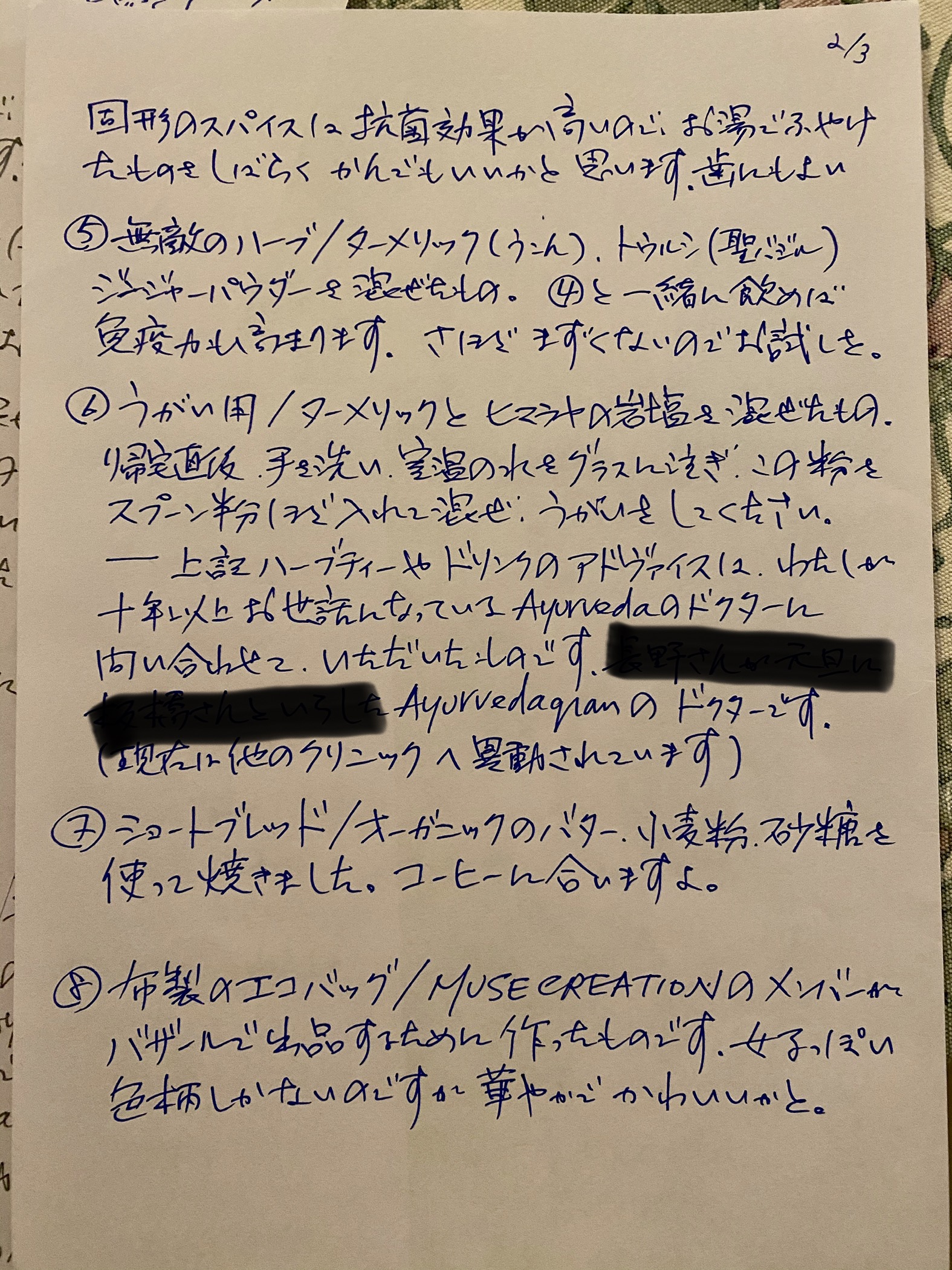 駐在員の方々は入れ替わりつつも、今は更に、厳しい状況に対応されている。「レスキューバッグ2020」に引き続き、一昨日も「レスキューバッグ2021」を、SAKRA WORLD HOSPITAL及びジャパニーズヘルプデスクに差し入れした。個人的に気に入っているものに加え、わたしが十年以上お世話になっているアーユルヴェーダのドクターにアドヴァイスを受けて用意した、ハーブやスパイスなども。
