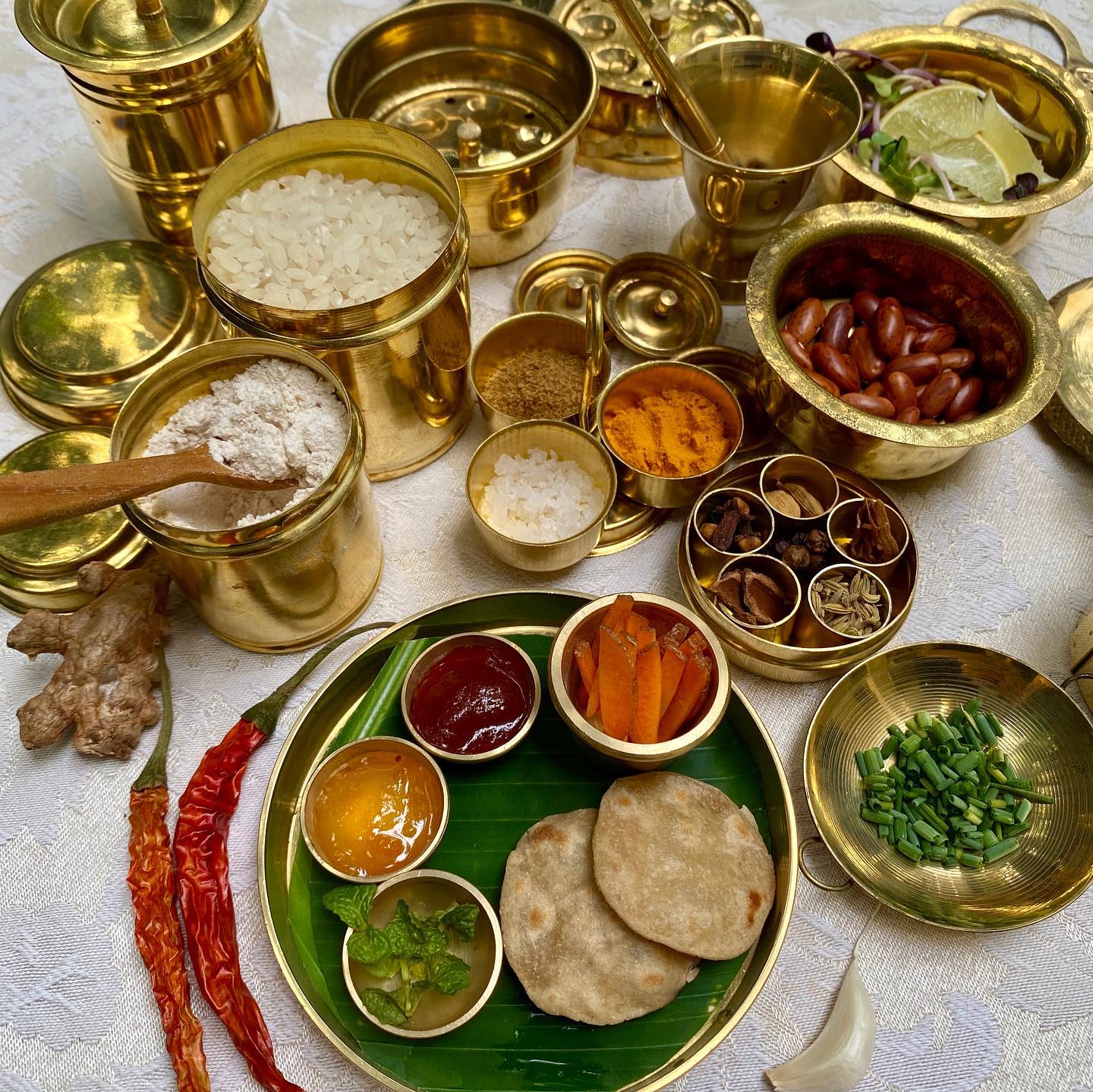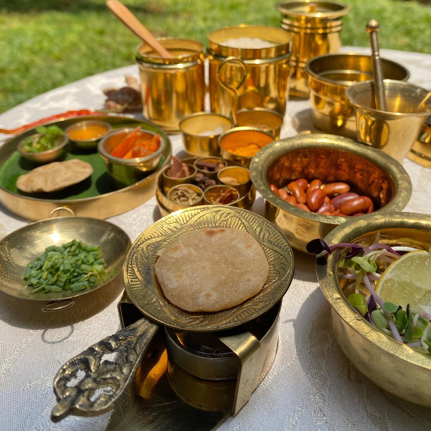 最初は乾燥したスパイスや穀物などだけを添えるつもりが、せっかくだからとプレートに庭の葉っぱを敷いてバナナリーフに見立てたり、カトリ(小さな器)にケチャップやジャム(!)を入れてそれっぽくしたり、にんじんやチャイブを切ったり、チャパティを捏ねたりとだんだんエスカレート。