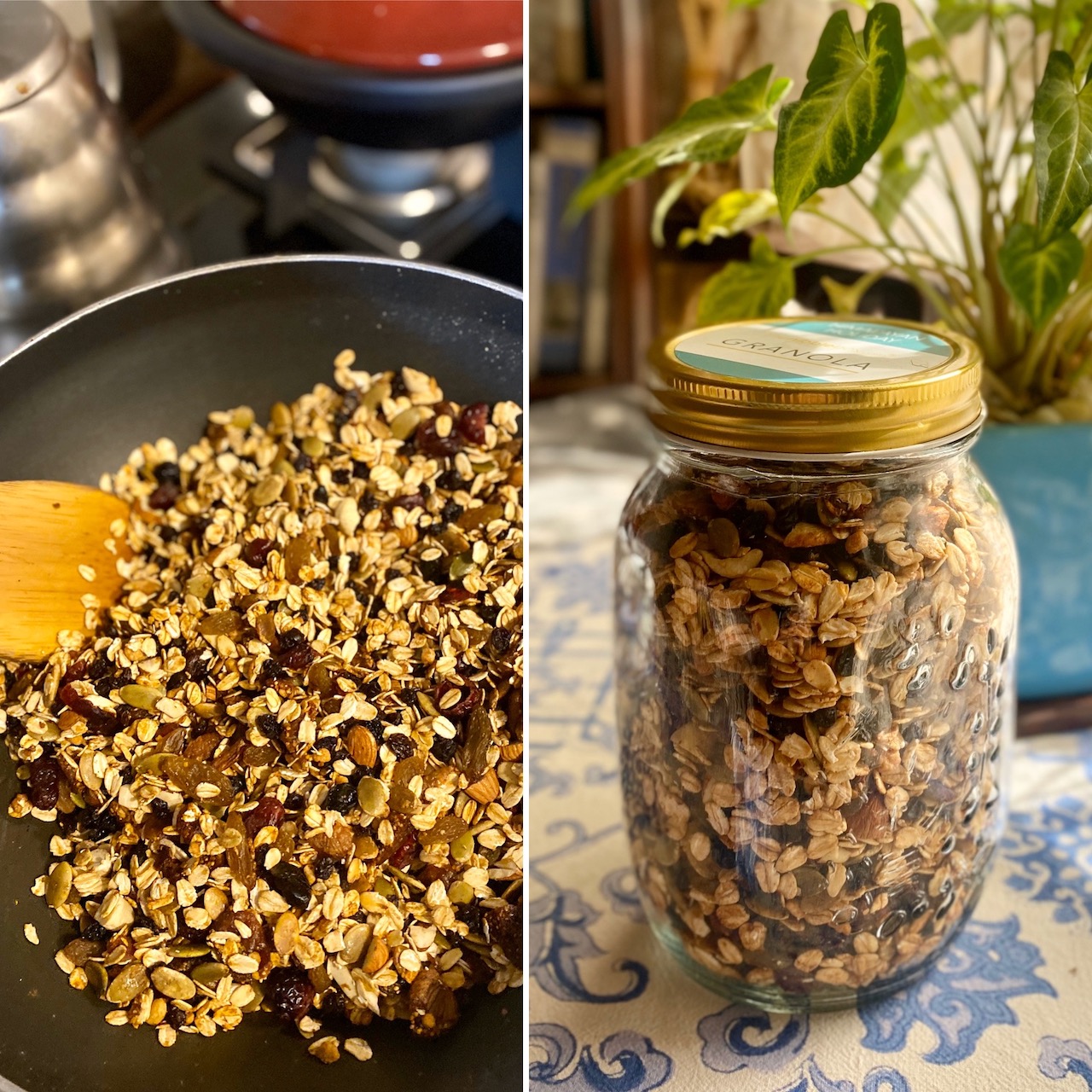主食は、先日も紹介した自家製のミューズリ。あるいはオートミール。前の晩の残りご飯があるときには、味噌汁にご飯とわかめ、卵を入れてのお粥など。