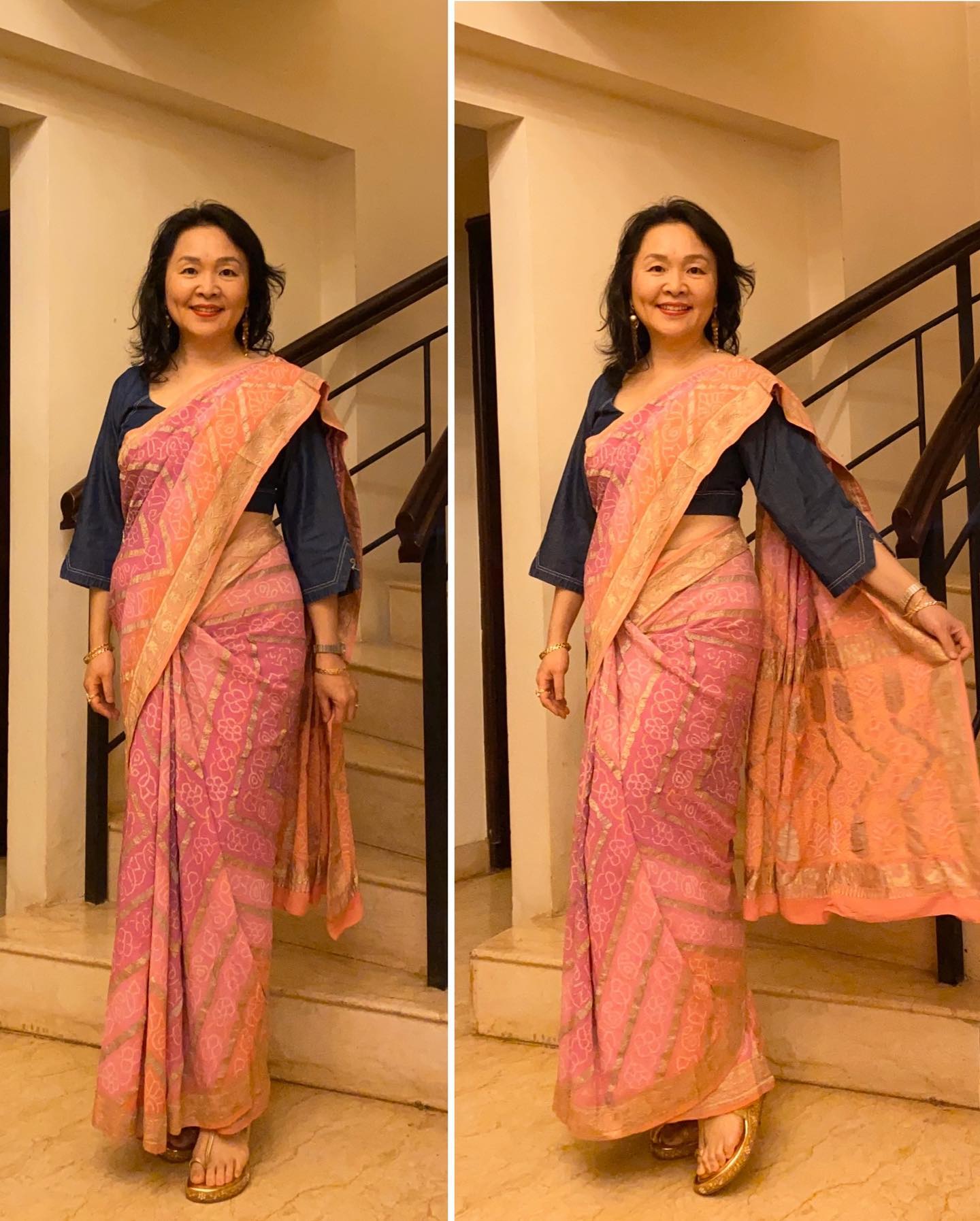 最後の写真は、昨年、お揃いの布で作ったブラウスと合わせた「普通」の着方。昨夜は敢えて、「コンセプトが異なる好みのブラウス」を合わせるという「今時の着こなし」をした。TATAグループ傘下のサリー専門店TANEIRAで購入した既製品だ。