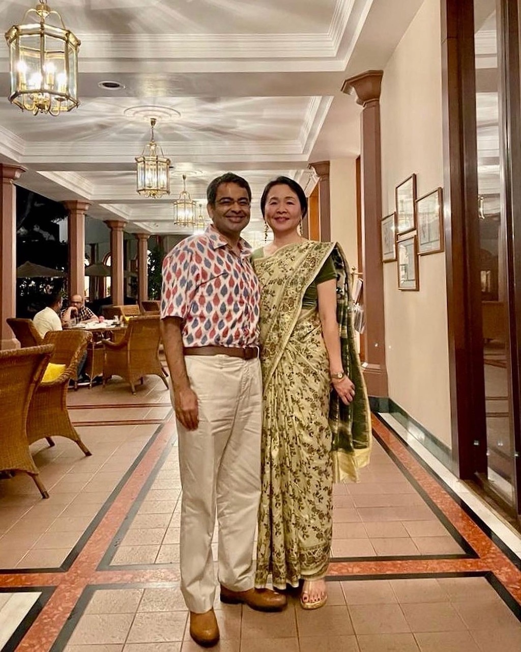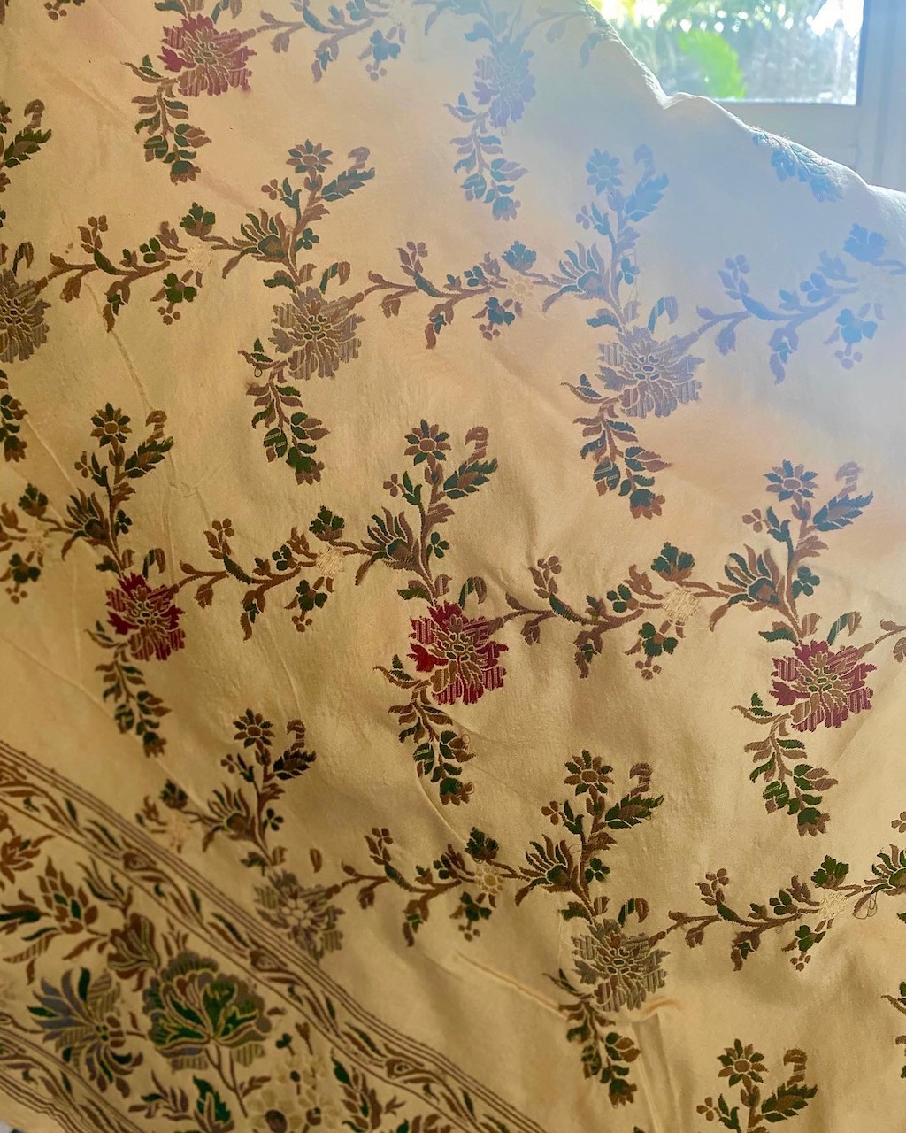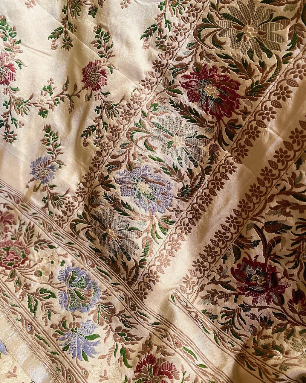 I am wearing a Banarasi saree which is made in Varanasi (complicated). I bought this hand-woven saree about 10 years ago at Kala Niketan in Mumbai. I love the floral pattern, reminiscent of Botticelli's “Primavera”, spread over the soft yellow gold.