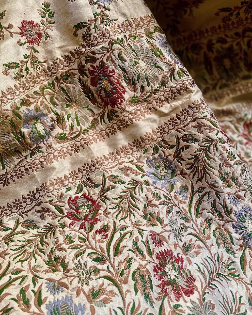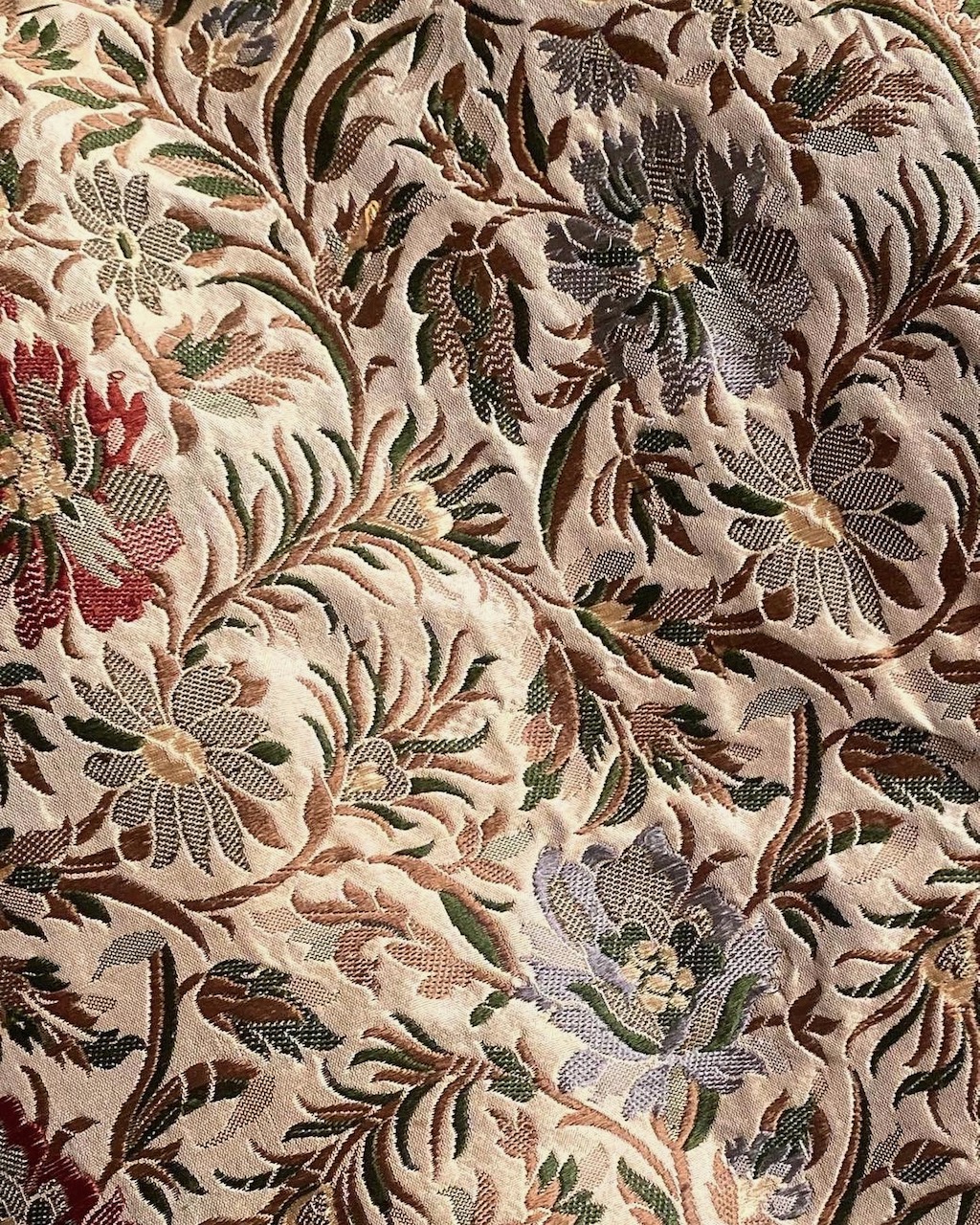 淡いゴールド・イエローの地に、花が織り込まれている。ボッティチェッリの『プリマヴェーラ』を思わせる柄が、とても気に入っている。