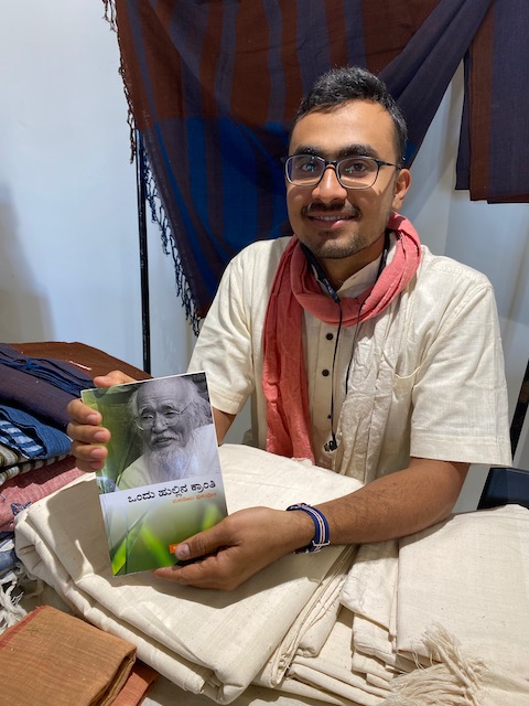 ……カンナダ語のその書籍の表紙に福岡正信氏の姿を認めて、声をかけた。青年が持っている本がそれだ。実はわたしは、福岡正信氏のことを、インド移住直後に赴いたオーガニックのバザールで初めて知ったのだった。
