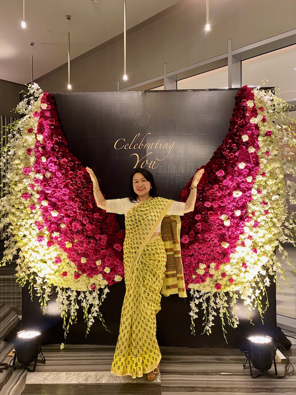 アミ・パテルのプレゼンの冒頭は、サリーがテーマだった。若い世代へ向けてのサリーの「新しい着方」の提案など。そのとき、彼女がわたしの方を見て名前を尋ね、着こなしを褒めてくれたのだった。
