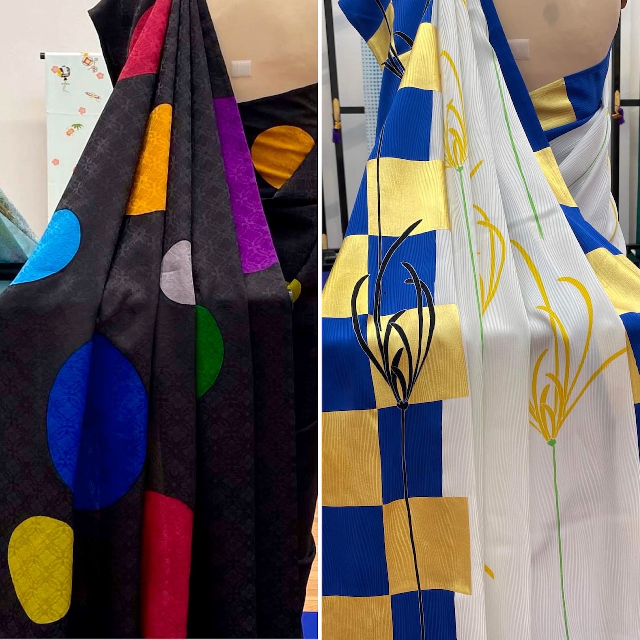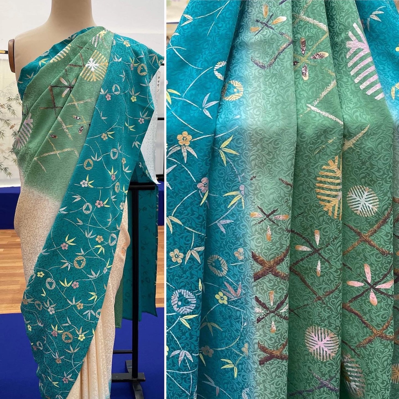 These are pictures of Kyoto Yuzen sarees. A saree uses a fabric three times wider than a kimono. This must have been a challenging experiment for the artisans.
