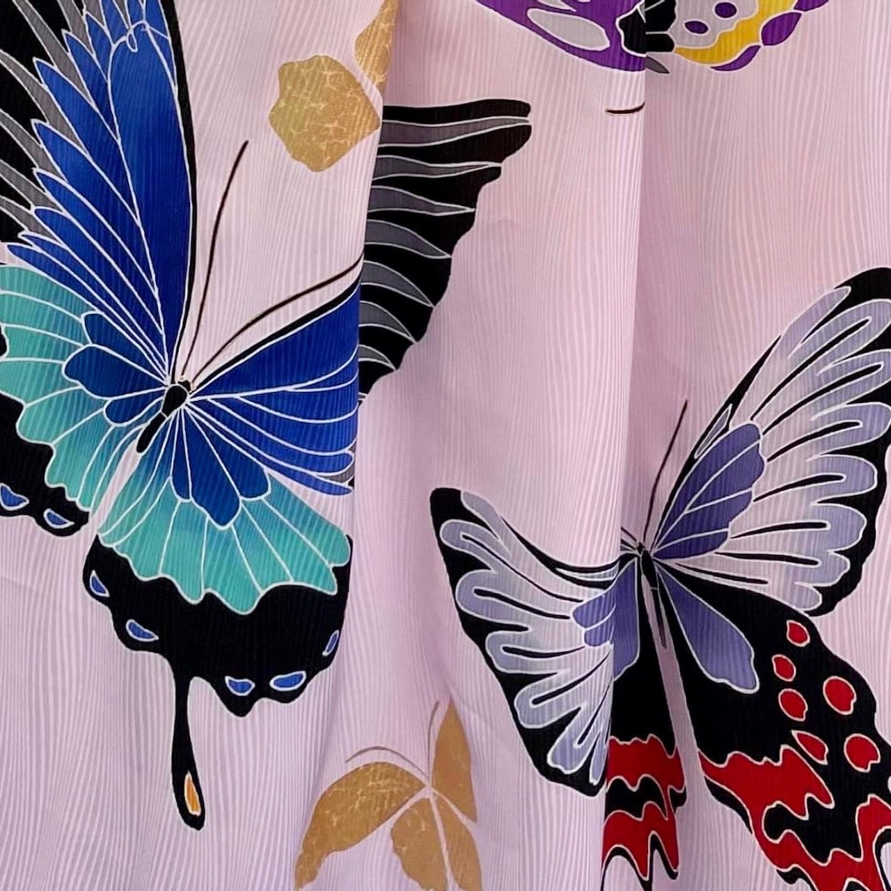 The fabric used for Kyoto Yuzen is a silk called Tango crepe (Tango Chirimen). It is a high quality product that is soft yet resilient. As you can see when you look closely at the fabric, a pattern is woven into the fabric.