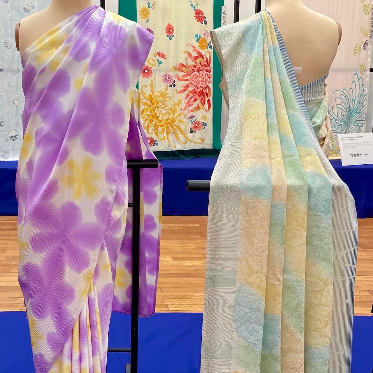 会場の一隅で展示されていた京友禅サリー。「京都府伝統産業 新規展開促進事業」と銘打たれている(長っ😅)。