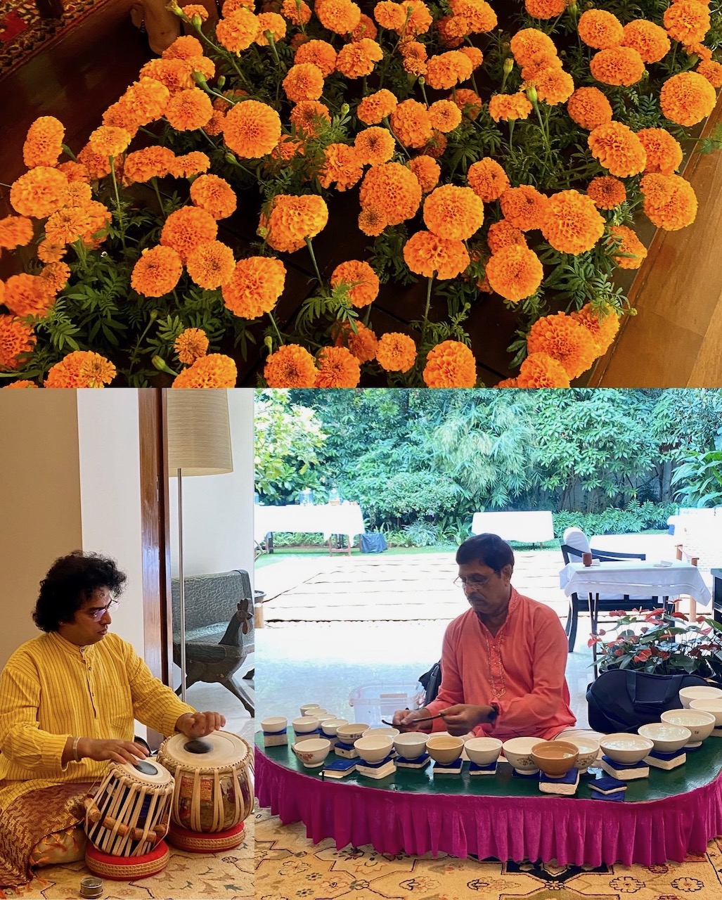 さて、マリーゴールドをはじめとする花々で彩られた邸宅。お茶やお菓子をいただきながら、友人らと言葉をかわしたあと、Jal Tarangと呼ばれる打楽器の演奏を聴く。陶磁器のボウルに水を満たし、木製の棒で叩きながら音を奏でる。木琴や鉄琴のような塩梅だ。水の量を調節することで、好みの音階を実現できる。