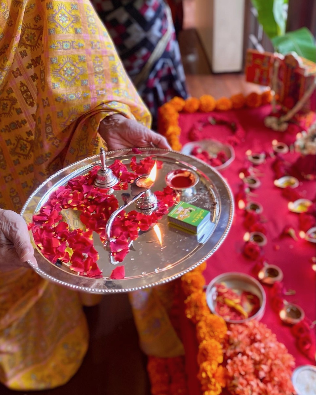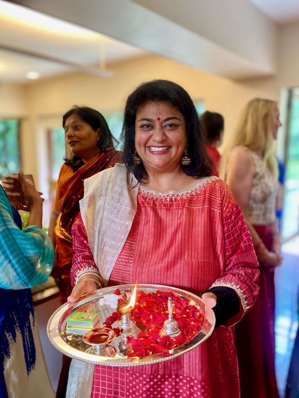 そのあとは、ディワリのプージャー(儀礼)、そしてランチと続く。ポットラック(持ち寄り)の美味ランチ! 白いサリーにカレーをこぼしてはならぬと緊張しつつも料理を楽しむ。