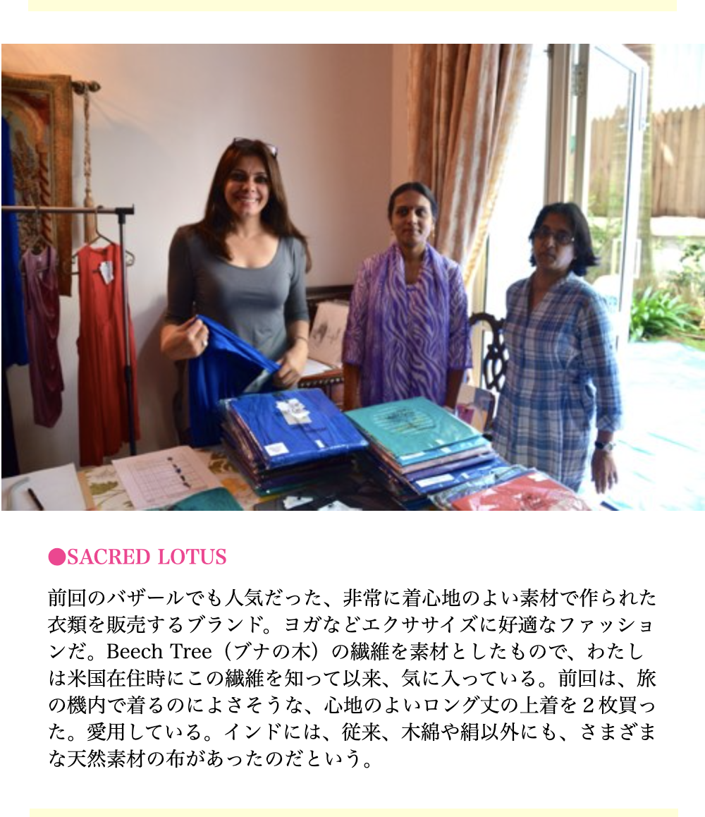 Beech Tree(ブナの木)の繊維を素材としたヨガ&コンフォートウエアのブランド。坂田は10年近く愛用。ミューズ・クリエイションのバザールに出店してもらった時期もあった。特にロング丈の羽織るトップは、旅行時に役立つことから、これまで色違いで5枚ほど購入。