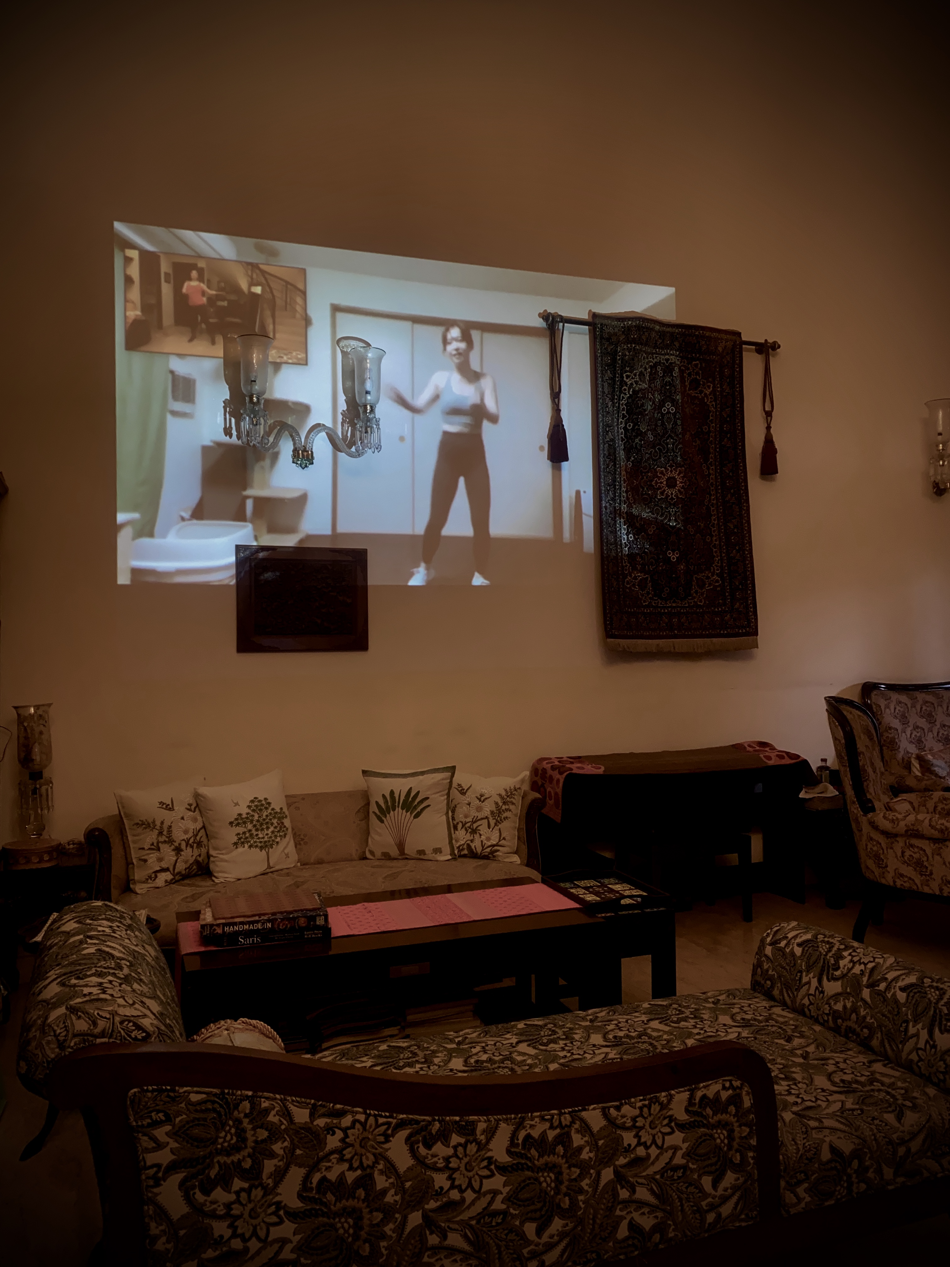昨日のオンライン・ダンスは、普段ミューズ・リンクスのセミナーで使ってきた「プロジェクタ」を引っ張り出してきた。ラップトップのモニターは小さすぎる。かと言って、デスクトップを移動させるのもたいへん。スクリーンを準備するのは面倒だったので、壁に照射する。諸々、障害物は気になるものの、大きな画面を見ているだけで、自分の動きも大きくなるようで、いい感じ。