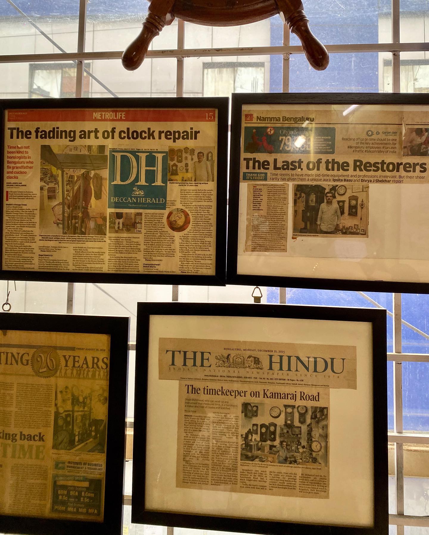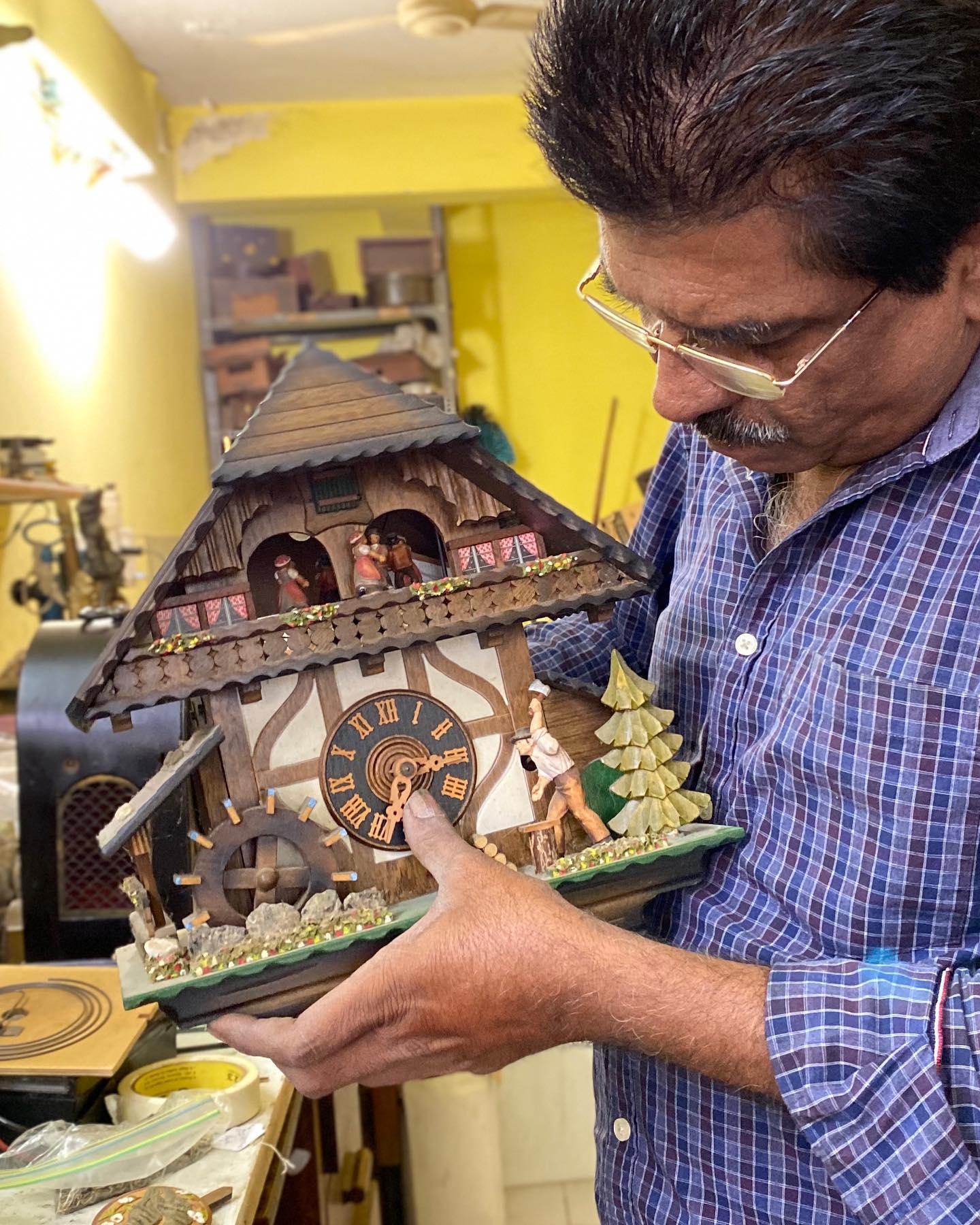 バンガロールの時計修理工としては有名な、時計をこよなく愛するShaik氏の店。彼のことは、ホームページや新聞記事を読んで知っていた。コマーシャルストリートの路地を入り、細い階段をのぼった先で、美しい置き時計を修理する彼の姿があった。