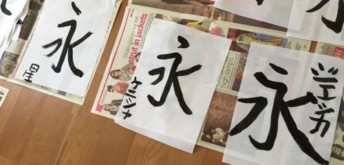というわけで、一人当たり都合3枚。練習もなく、3枚だけ。にもかかわらず、みなそれぞれに、個性豊かに、いい「永」を書いてくれたのには、驚いた。